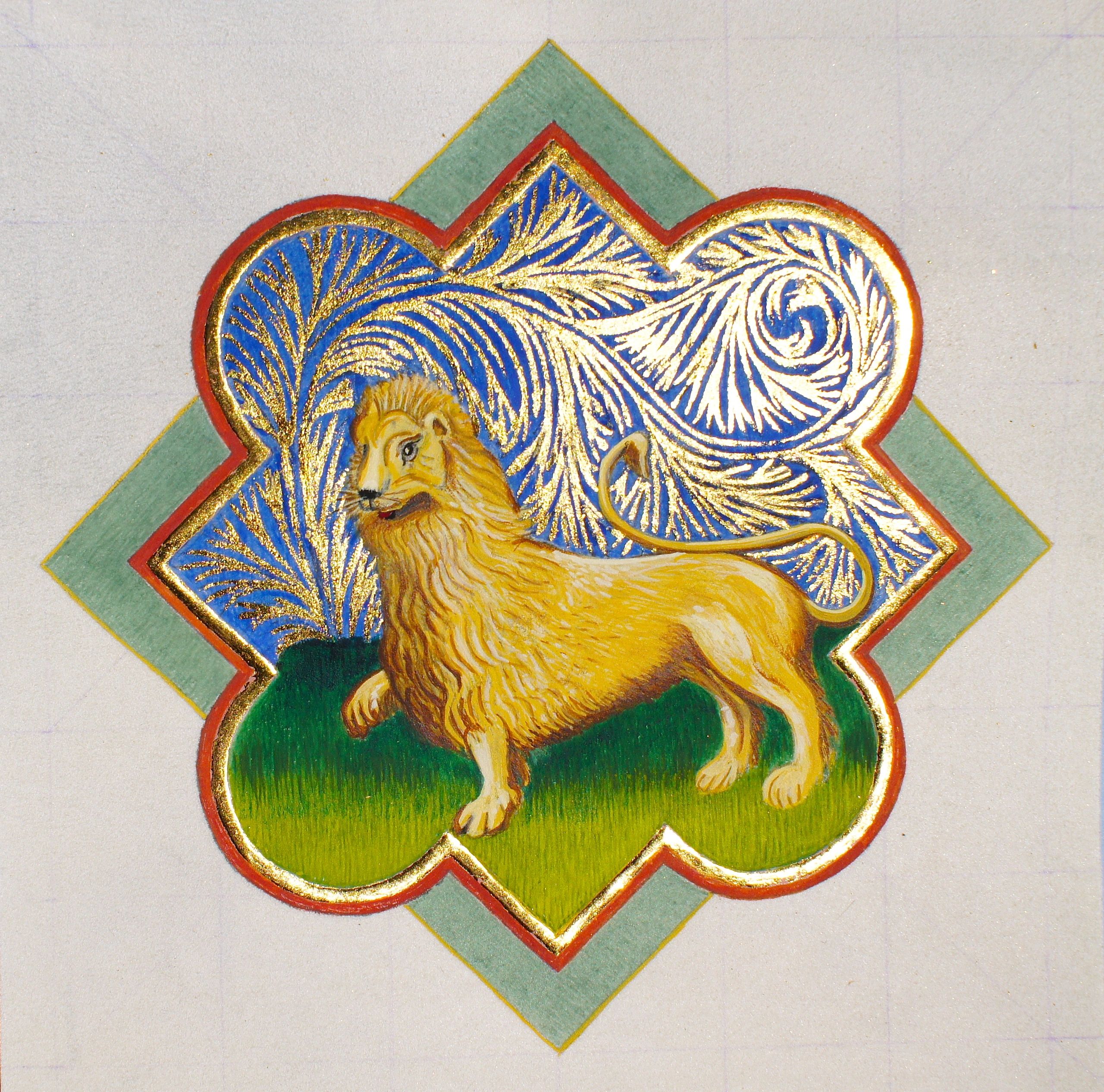 The lion - this 7.5" x 7.5" illuminated manuscript, using mordant gilding (garlic juice) to highlight the flourish painted over the colored background. Traditional 14th c. medieval style in 24k raised gilding border & watercolor on goatskin parchment. Sold.