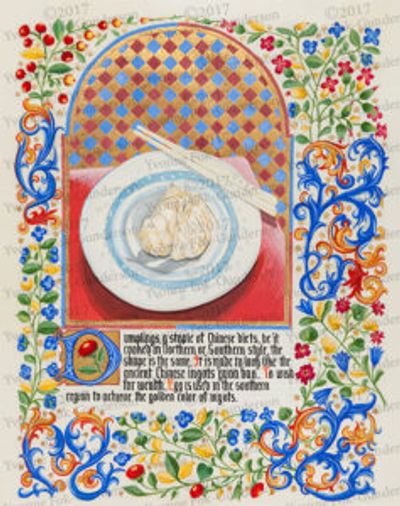 My medium is traditional watercolor, 24k gold gilding, & shell gold painting on goatskin parchment. Beginning in 2007, I spent four years taking master classes from The Getty Museum Education Department, and learned the art of 14th century medieval style manuscript illumination. My first folio completed during that period of training is called “Eight-Treasure Rice, a.k.a. Ba Bao Fan”.