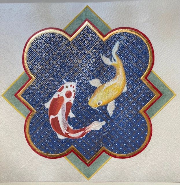 The second of the series. This 7.5" x 7.5" illuminated manuscript consists of layers of Lapis Lazuli pigment painted in the background with a shell gold grid on top. The koi fish add an element of orientalism to the piece. 24k raised gilding border on goatskin parchment. $3,750