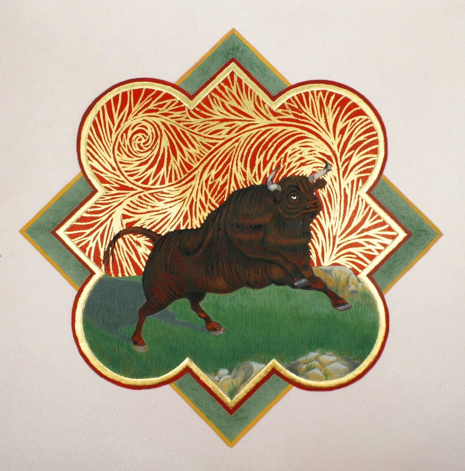 In the fierce manner of Delacroix & Goya's bullfig, the swirling of the matador's cape is transformed via the gilding on brilliant vermillion. A contrast of shimmering explosive gold to the fierce raging bull. 24k gold raised & mordant gilding + watercolor on goatskin parchment. $4,125