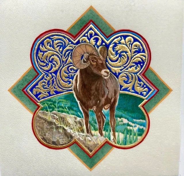 The third of the series. 7.5" x 7.5" piece uses delicate and subtle flourishes to capture the gentleness of the goat. Traditional fourteenth century medieval style in 24k gold gilding & watercolor painting on goatskin parchment. Sold.