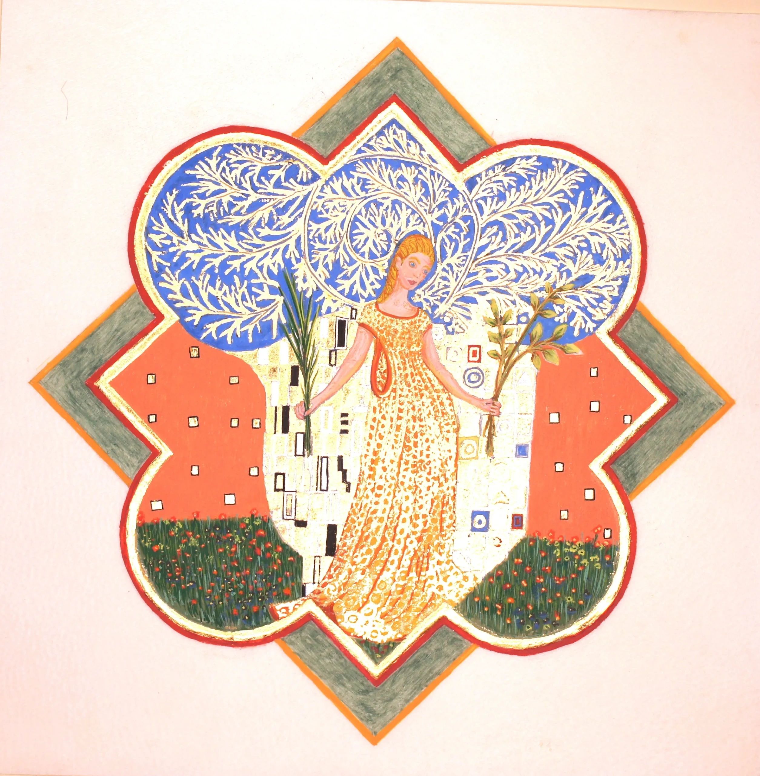 Homage to the Masters: this work carries the spirit of artist Gustav Klimt: beauty of the Golden Woman. This Virgo exemplifies Klimt's use of gold gilding, mosaic and geometric patterns. It is perfectly harmonized. The ground adds richness of a Klimt-style pastoral look. Actual Size: 7.5" x 7.5". $3,975
